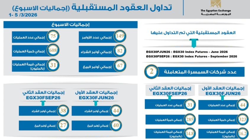 بلغ إجمالي عدد العمليات المنفذة خلال الأسبوع ببورصة العقود الآجلة (1 – 5 مارس 2026) 75 عملية، بينما وصل إجمالي عدد الأوامر إلى 149 أمرًا. وتوزعت هذه الأوامر بين 82 أمر شراء و67 أمر بيع. أما إجمالي كمية العمليات المنفذة فقد بلغ 608 عقدًا، بإجمالي قيمة تداول وصلت إلى حوالي 31 مليون جنيه.