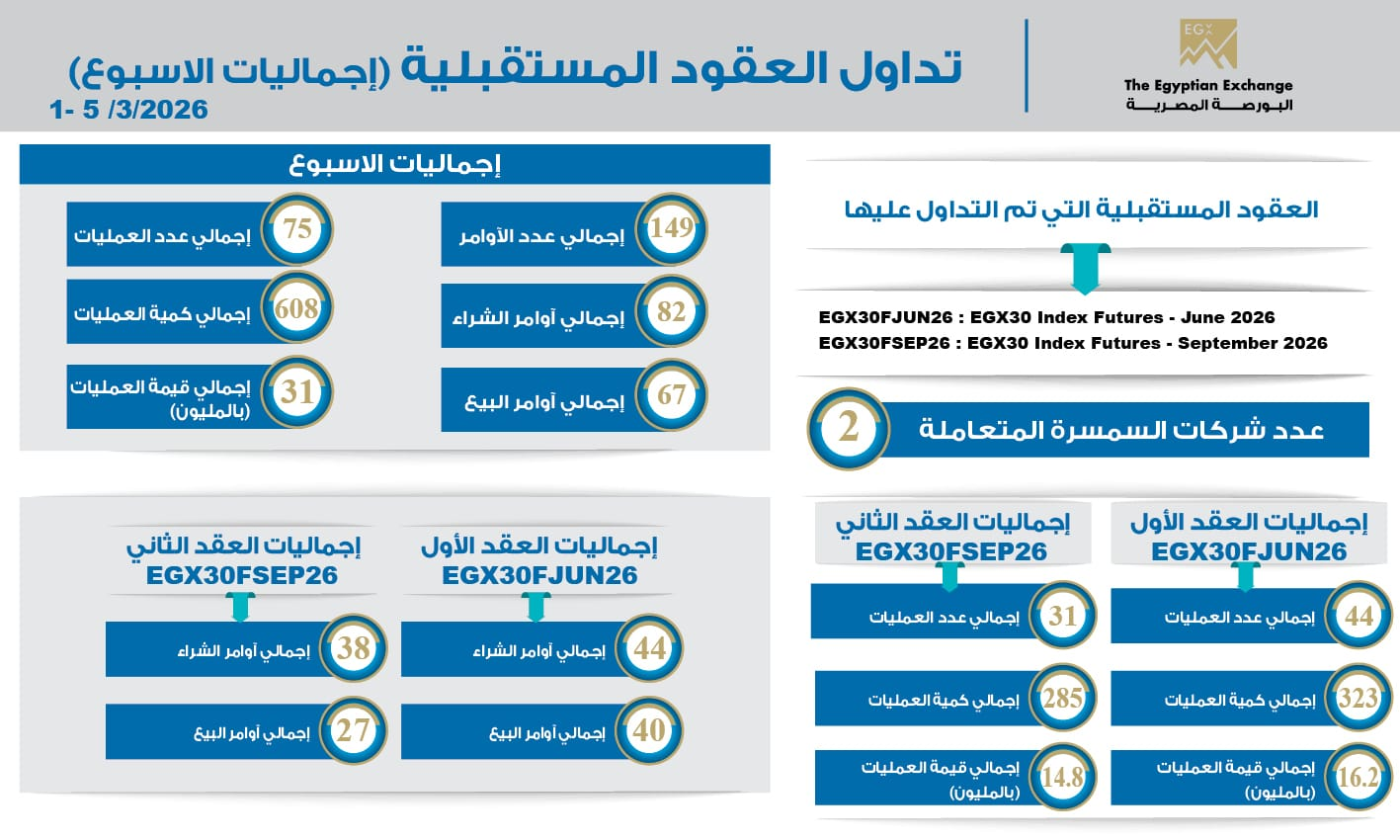 تم التداول خلال هذا الأسبوع على عقدين من العقود المستقبلية المرتبطة بمؤشر EGX30، وهما: