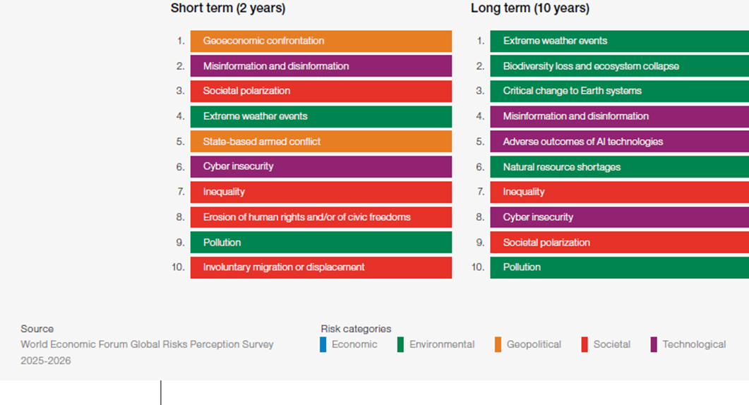 وبالنظر إلى ترتيب الأخطار من حيث الإطار الزمنى؛ تظهر المواجهة الجيواقتصادية في قمة مشهد الأخطار العالمية لعام 2026، إذ أظهرت نتيجة الاستقصاء استمرارها على قمة الأخطار على مدى عامين (حتى عام 2028).
