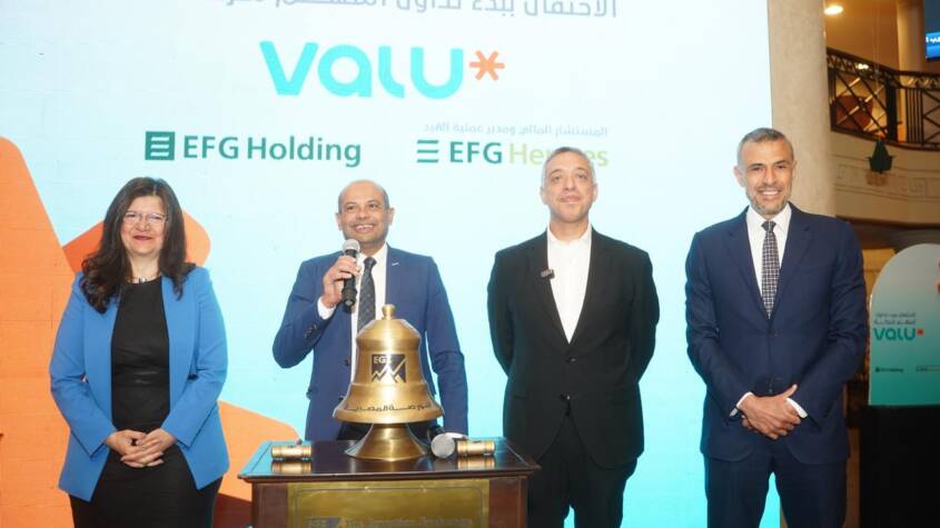 جاء ذلك خلال احتفال شركة فاليو ببدء التداول على أسهمها، خلال جلسة اليوم الاثنين، ، بحضور هبة الصيرفي – نائب رئيس البورصة المصرية، ومشاركة كلا من: كريم عوض – الرئيس التنفيذي لمجموعة إي اف چي القابضة ووليد حسونة – الرئيس التنفيذي لـشركة “يو للتمويل الاستهلاكي” (VALU.CA)، وذلك ضمن فعالية “قرع الجرس” التي أقامتها البورصة المصرية احتفالا ببدء التداول على أسهم شركة “يو للتمويل الاستهلاكي” بعد قيدها بالسوق الرئيسي.